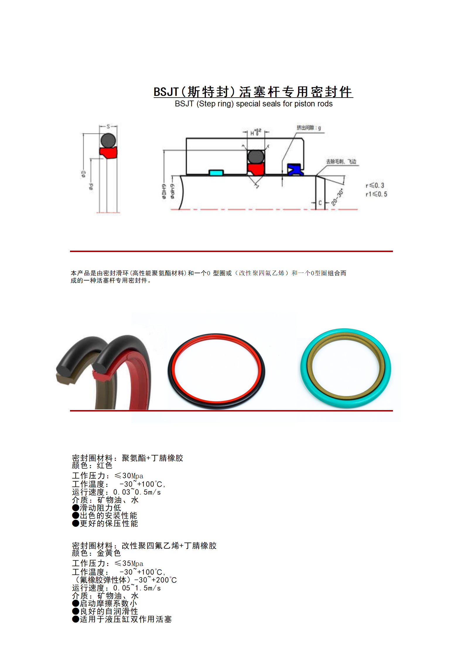 用途:单向活塞杆密封,适用于轻载和中载液压缸。特点:1.泄油槽结构、抗挤出并有效防止困压和贯穿泄漏2.安装简单3.弹性体滑环对轻微划伤不敏感,更耐污4.材料的一致性优于烧结的PTFE5.相比PTFE密封性能更佳:6.低摩擦且无粘滑现象7.〇型圈防挤出